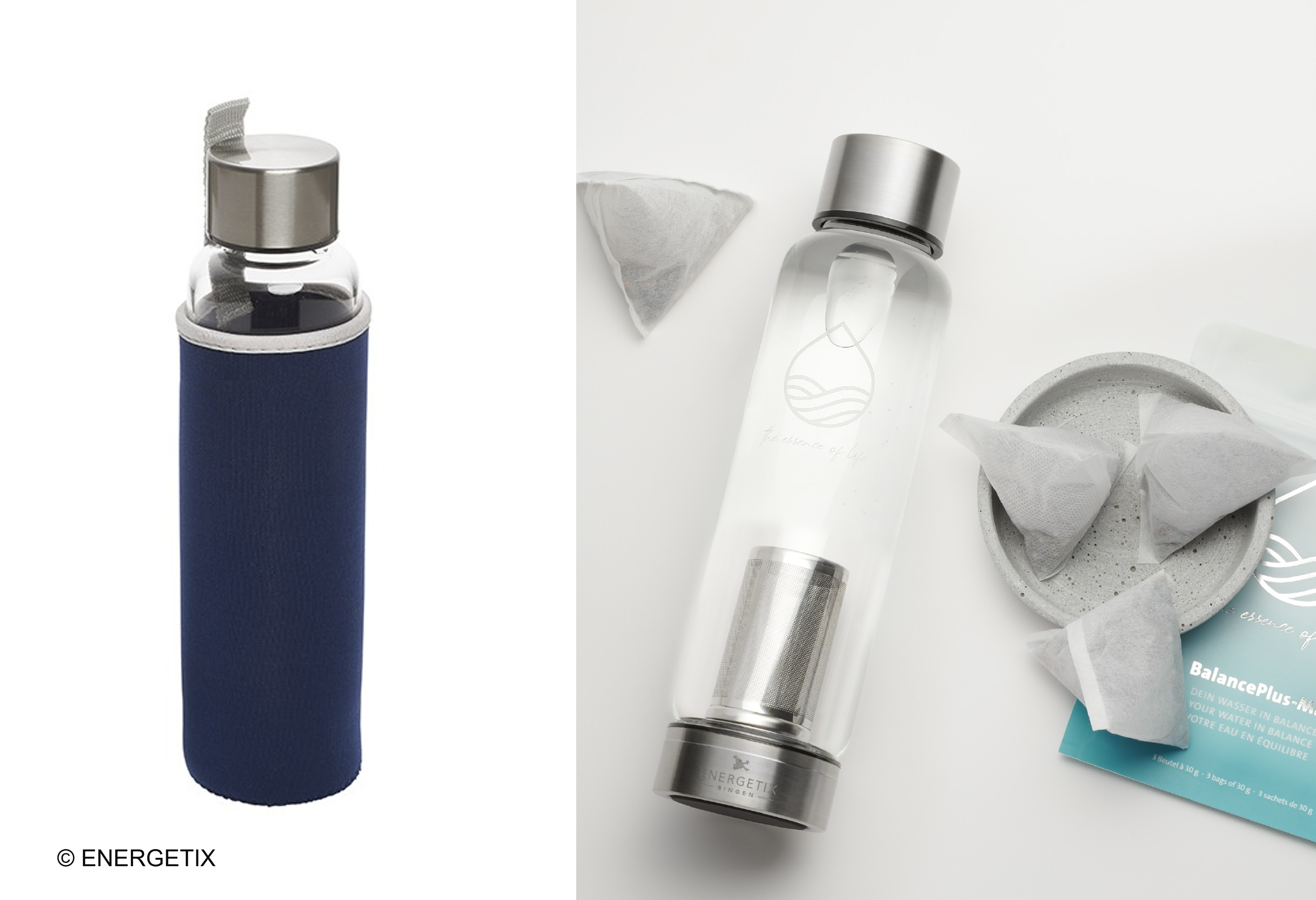 Unsere exklusive Trinkflasche (550 ml) aus klarem Borosilikatglas ist speziell für Menschen konzipiert, die ständig in Bewegung sind. Mit ihrem integrierten Edelstahlsieb ist sie perfekt geeignet, um sie mit unserem BalancePlus-Mix, frischem Tee oder aromatischen Früchten zu füllen – ein echtes Plus für unterwegs! Das Sieb lässt sich mühelos über den abschraubbaren Boden befüllen oder ganz entfernen. Zusätzlich ist ein leistungsstarker Magnet (0,2 Tesla) im Flaschenboden integriert, der dem Wasser eine zusätzliche Wertigkeit verleiht. Dank der mitgelieferten Neoprenhülle ist die Trinkflasche nicht nur überallhin mitnehmbar, sondern bleibt auch stets gut geschützt.